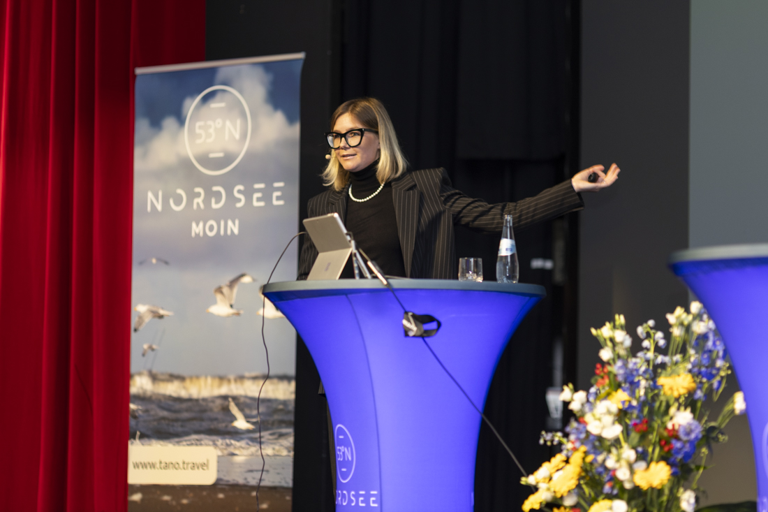• Das Bild zeigt die Moderatorin Carola Schede des NordseeTourismusTags 2026 in Leer. Carola Schede steht am Strand.